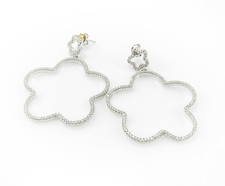 Pendientes Flor Largos En Plata Rodiada Con Circonitas Micro