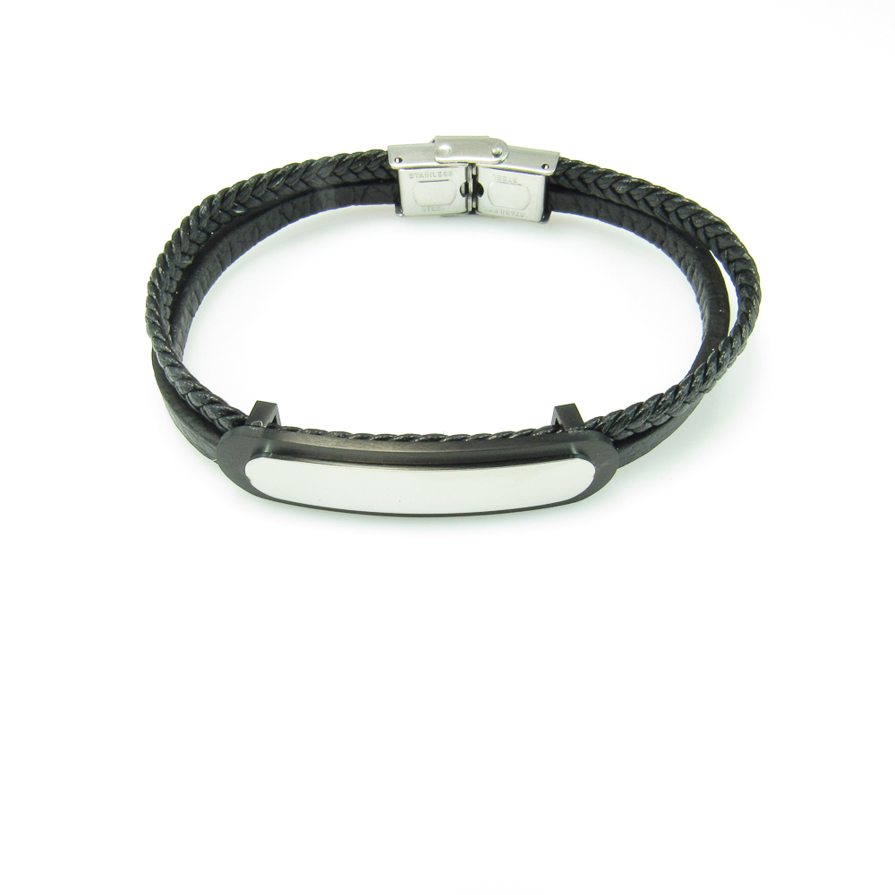 Pulsera Piel Lisa Y Trenzada De Cuero Negro Con Placa De Acero